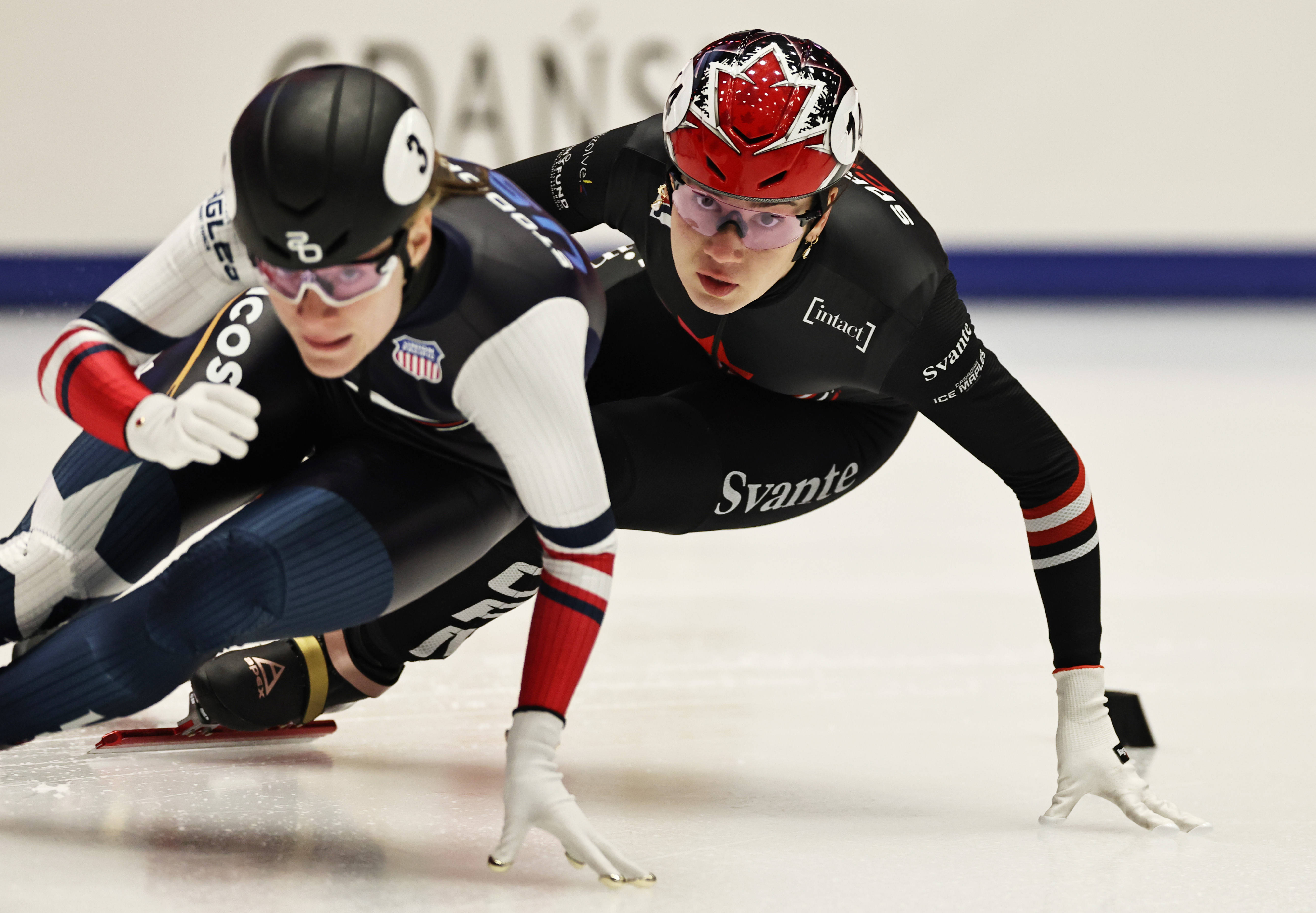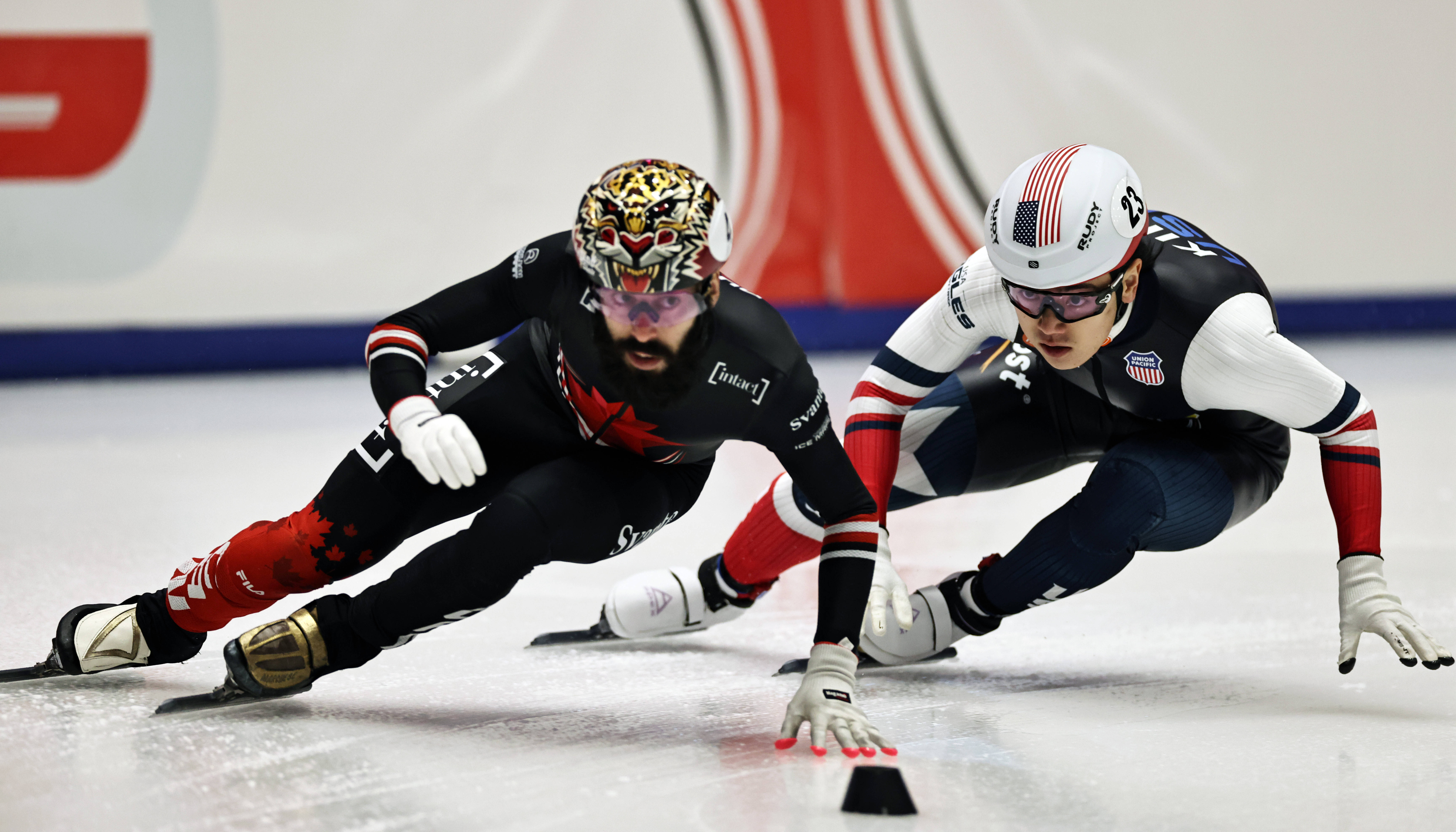 11月20日,加拿大队选手萨罗尔特(左)在比赛中。最终,加拿大队以2分41秒818的成绩晋级半决赛。 新华社记者 高静 摄