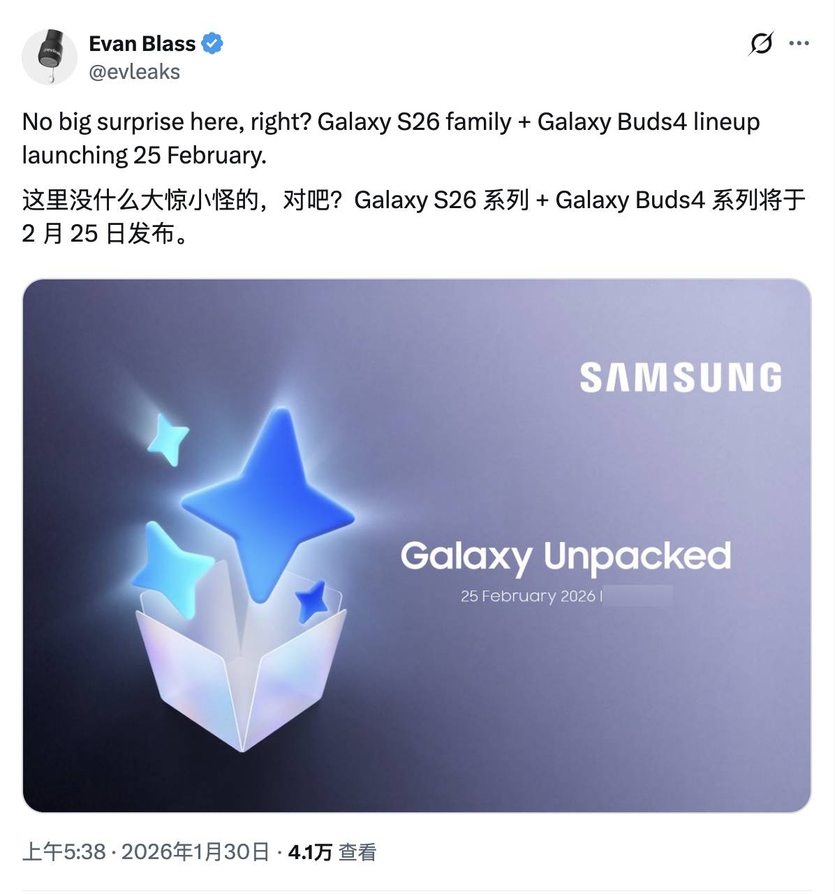 海报信息与此前多轮爆料一致。报道提到,三星虽然早前确认今年上半年会推出新旗舰,但至今尚未启动正式宣传。除 Ultra 机型已公布的「Privacy Display」隐私显示功能预告外,官方尚未披露更多细节。