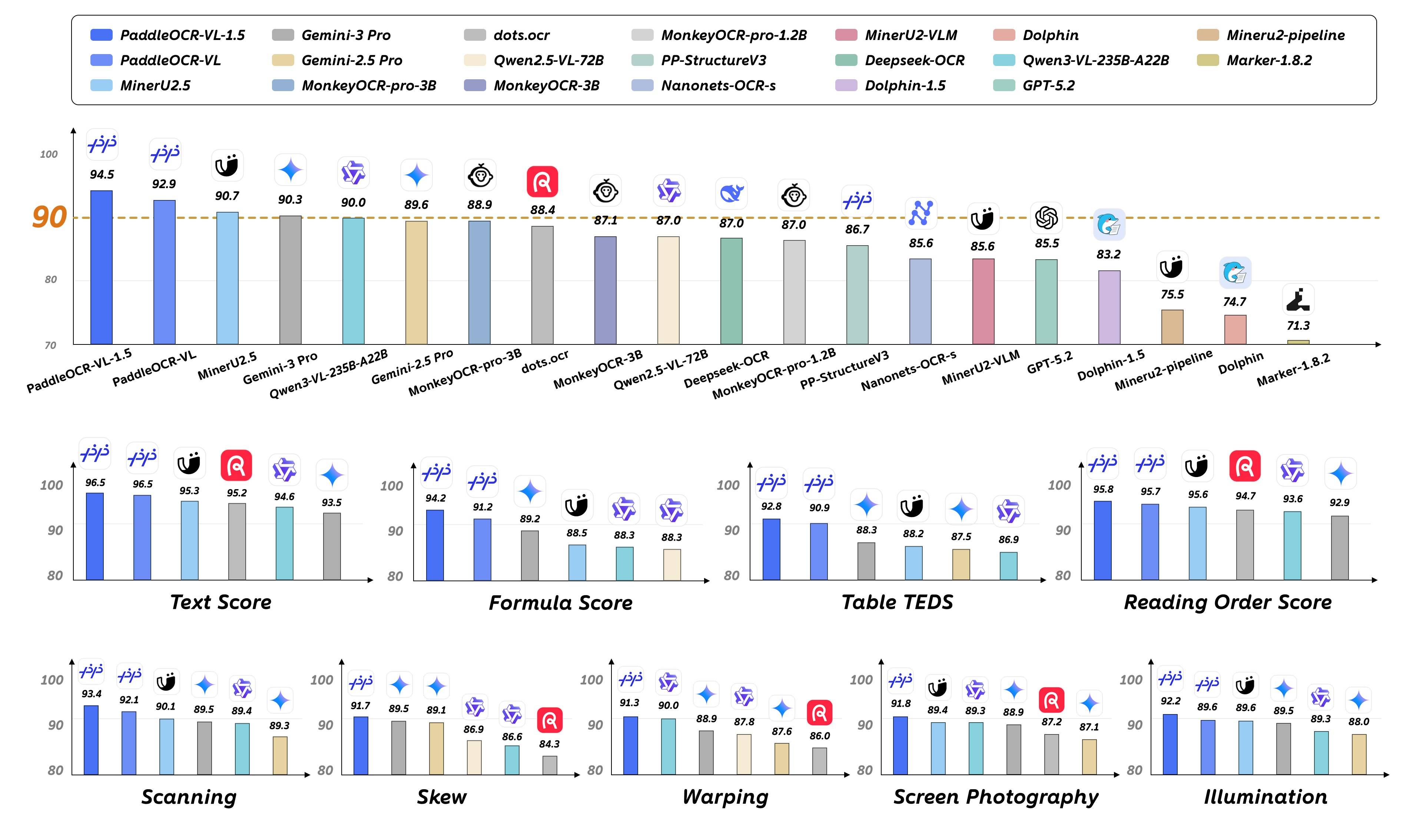 PaddleOCR-VL-1.5 采用仅 0.9B 参数的轻量化架构,但在多项关键指标上实现领先。其中,表格结构理解得分为 92.8 分,阅读顺序预测得分为 95.8 分,均位列榜单第一。